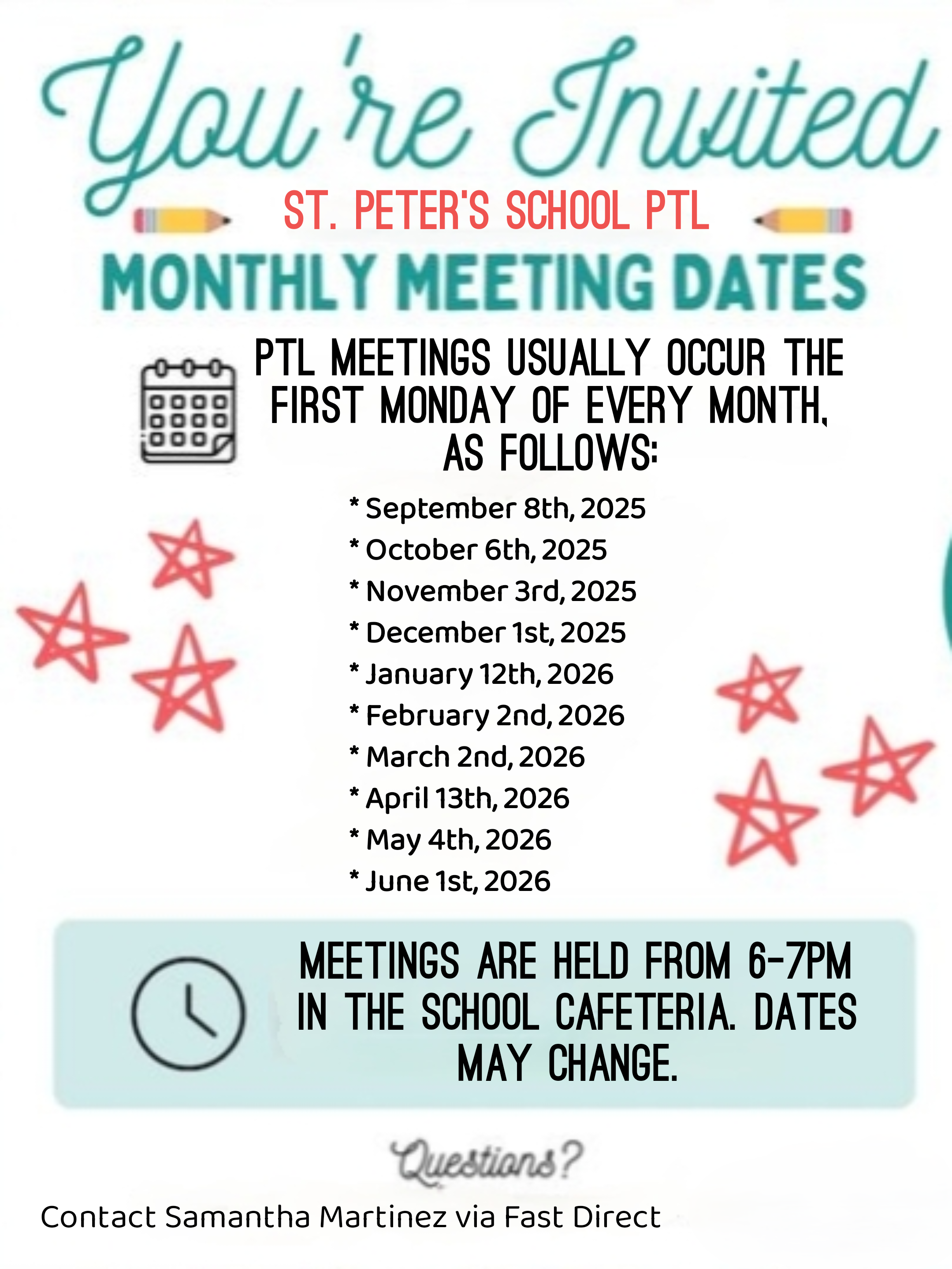 All parents are part of the P.T.L. Our PTL typically meets at 6 pm on the first Monday of the month in the basement. Please join us! If you would like more information please contact Samantha Martinez, president, through Fast Direct.